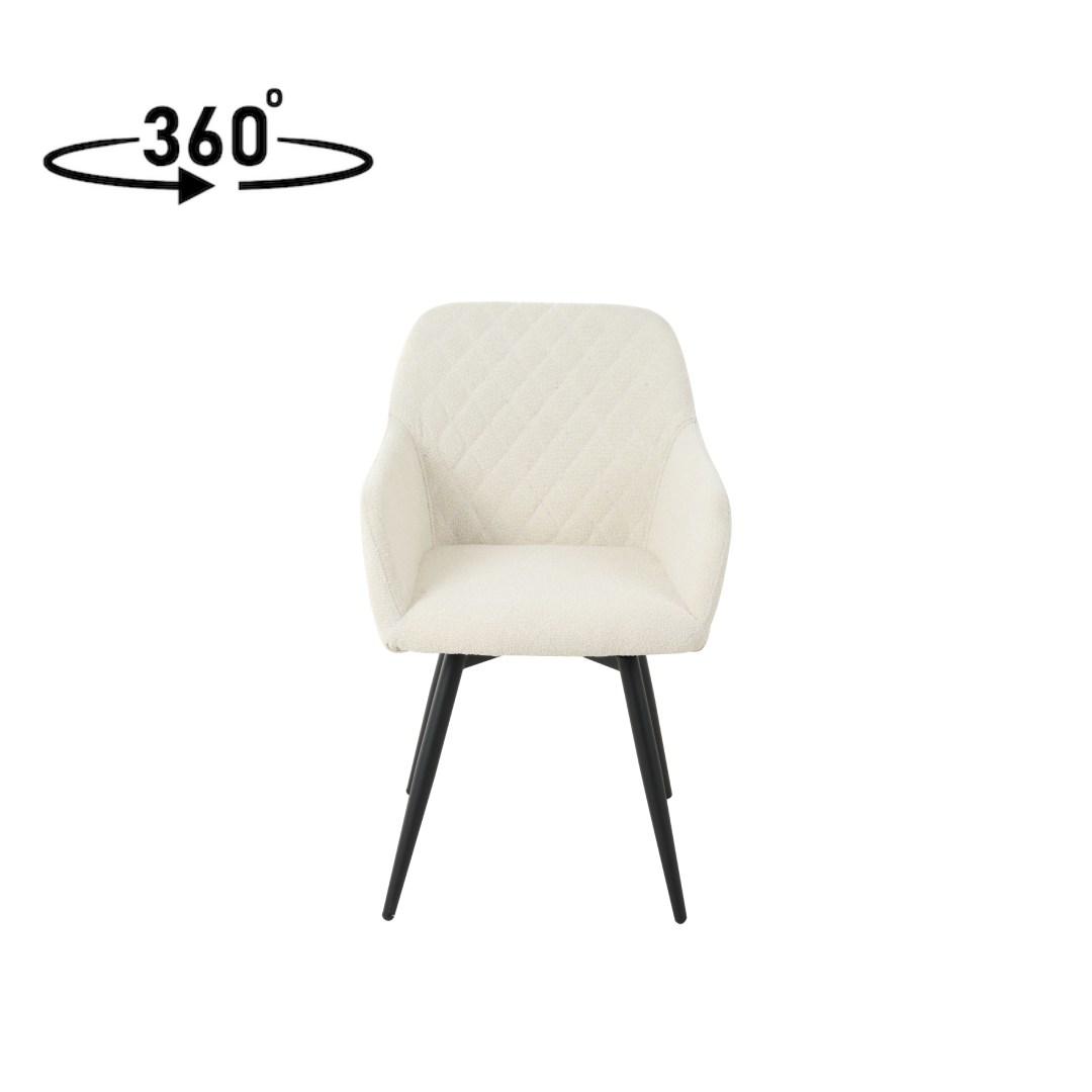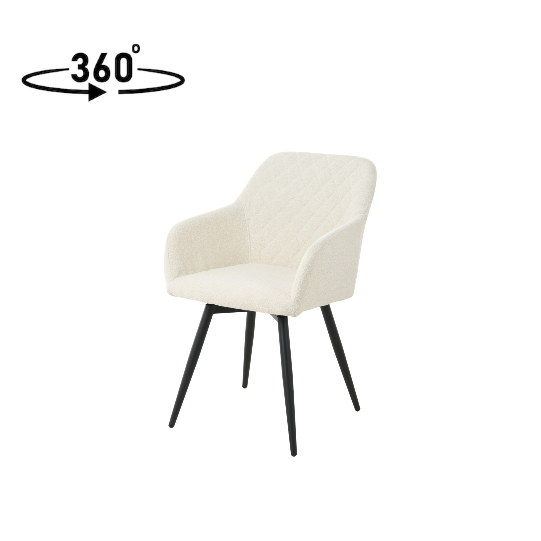 Creëer een tijdloze en frisse uitstraling in uw eetkamer met de Horsens eetkamerstoel in de kleur wit. Deze zachte bouclé stof bekleding in helder wit brengt een gevoel van ruimte en lichtheid in uw interieur. Wat deze stoel extra speciaal maakt, is dat hij draaibaar is, waardoor u moeiteloos vanuit verschillende hoeken kunt genieten van uw maaltijden.