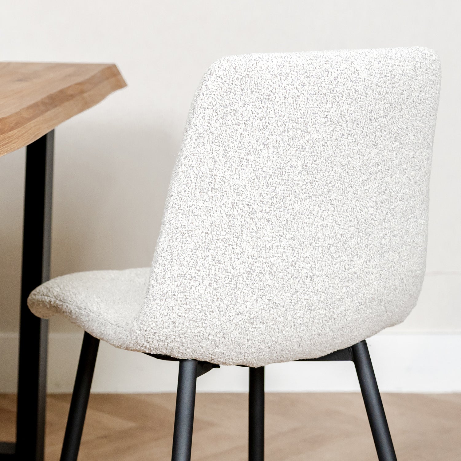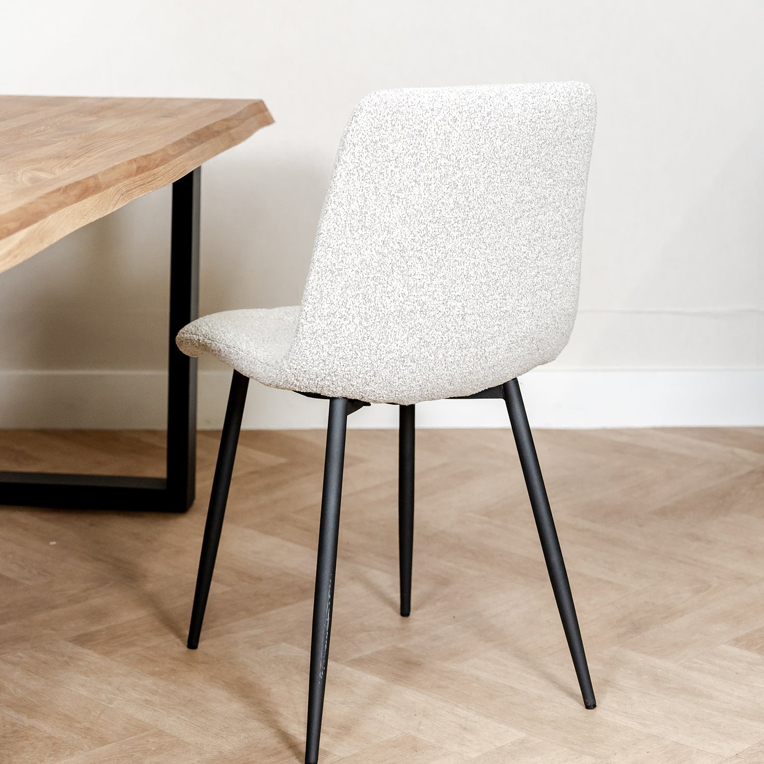 Eetkamerstoel Juul is een prachtige trendy stoel, verkrijgbaar in verschillende kleuren in de stof Bouclé. De moderne eetkamerstoel heeft een vierkant gevormde zitting met elegante rondingen. De rugleuning en zitting hebben een zogenoemd 'gecapitonneerd stiksel' waardoor het 3D effect van het zachte foam wordt geaccentueerd. Dat zit lekker zacht!