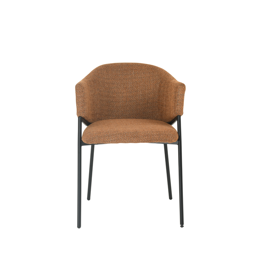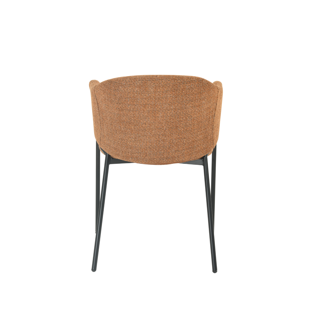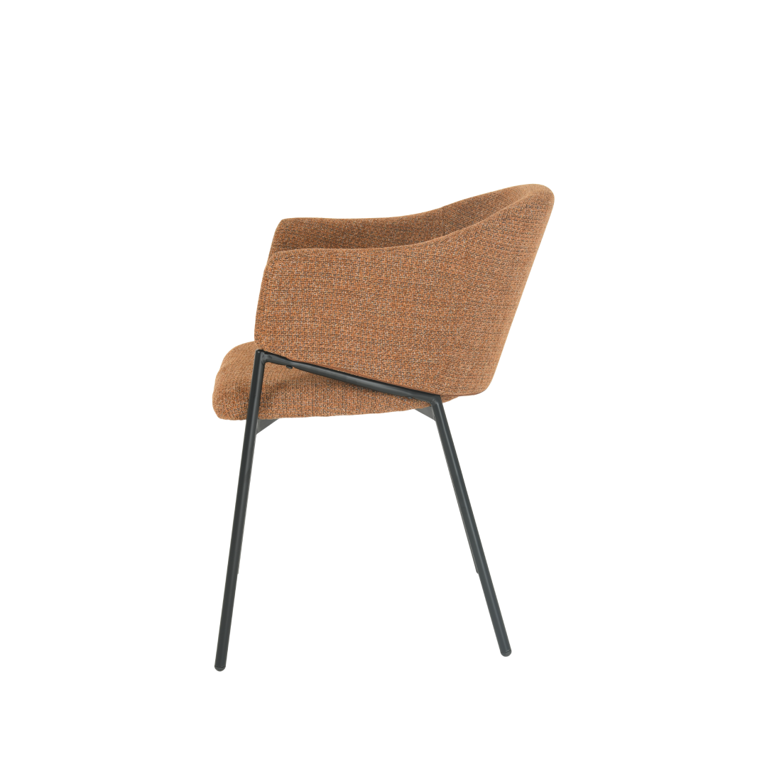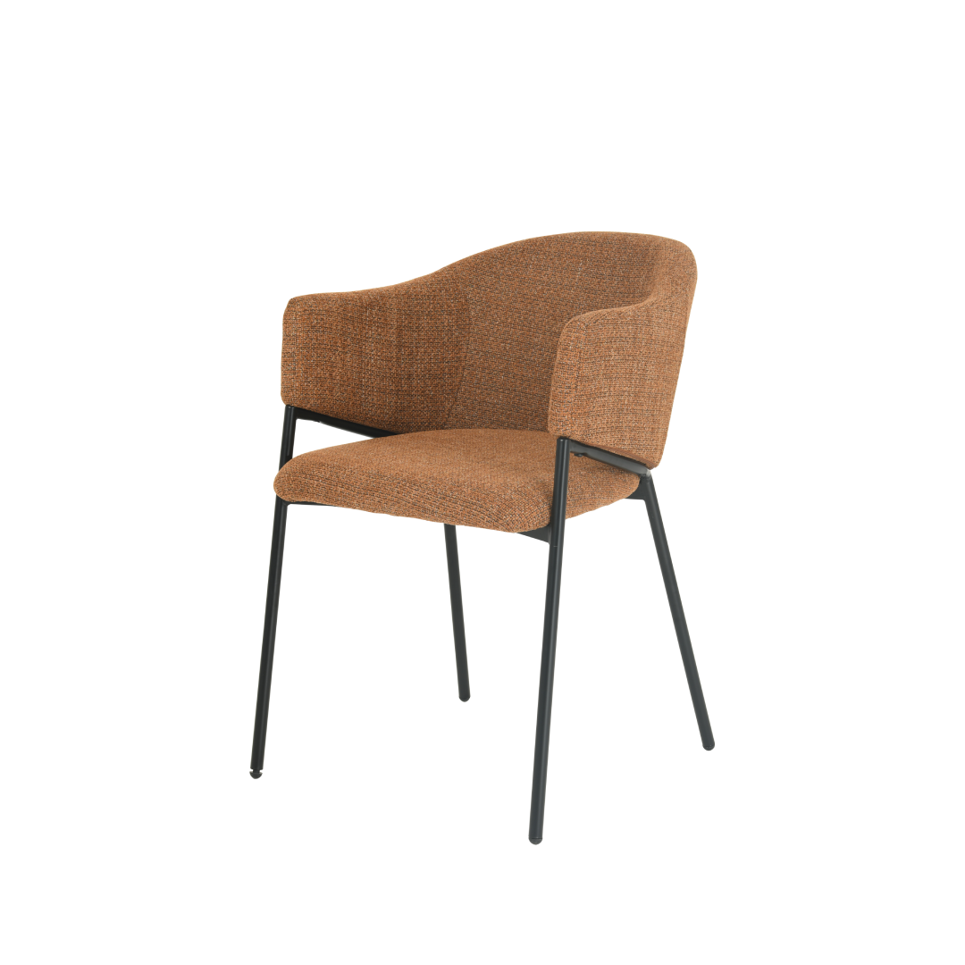 De combinatie van een cognac-kleurige linnen stof en een strak zwart metalen onderstel creëert een elegante en eigentijdse uitstraling. De stoel is niet alleen een blikvanger, maar is ook gemaakt om lang mee te gaan. Het stevige zwarte onderstel zorgt voor stabiliteit, terwijl de linnen stof zacht en comfortabel aanvoelt.