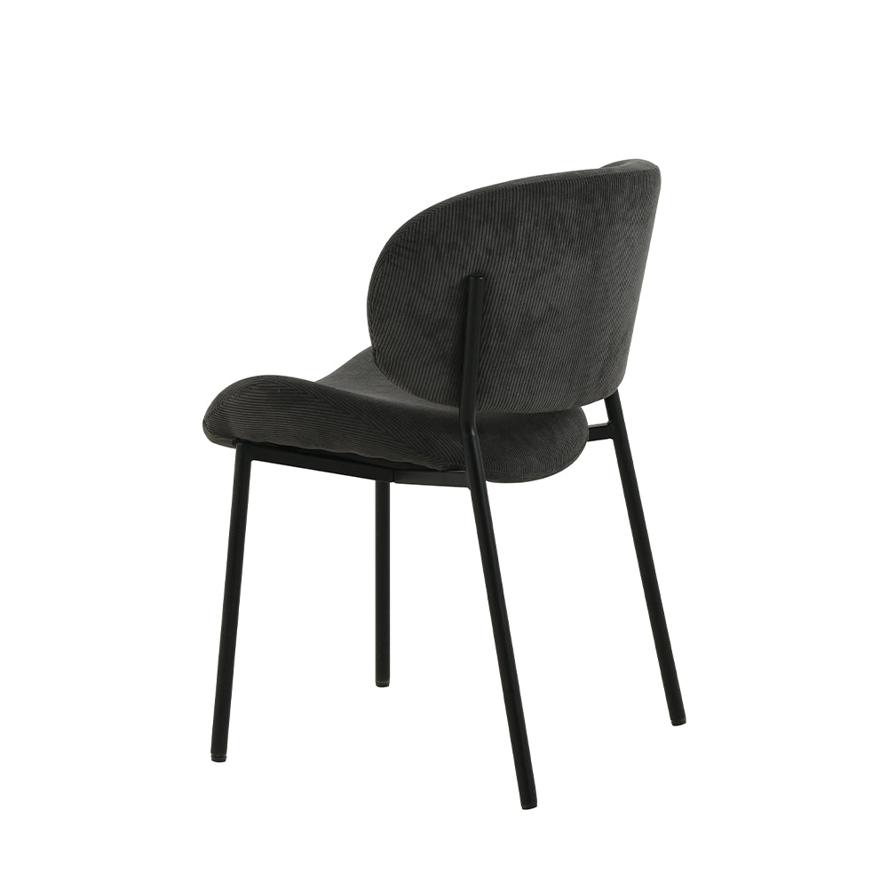 De donkergrijze ribstof voelt niet alleen luxe aan, maar is ook duurzaam en makkelijk te onderhouden. Het voegt textuur en warmte toe aan de stoel, waardoor hij extra uitnodigend wordt.