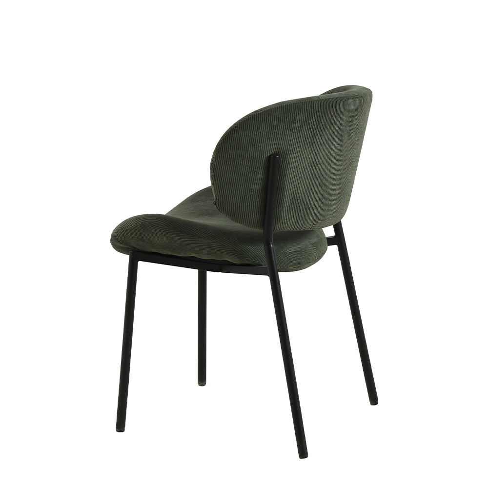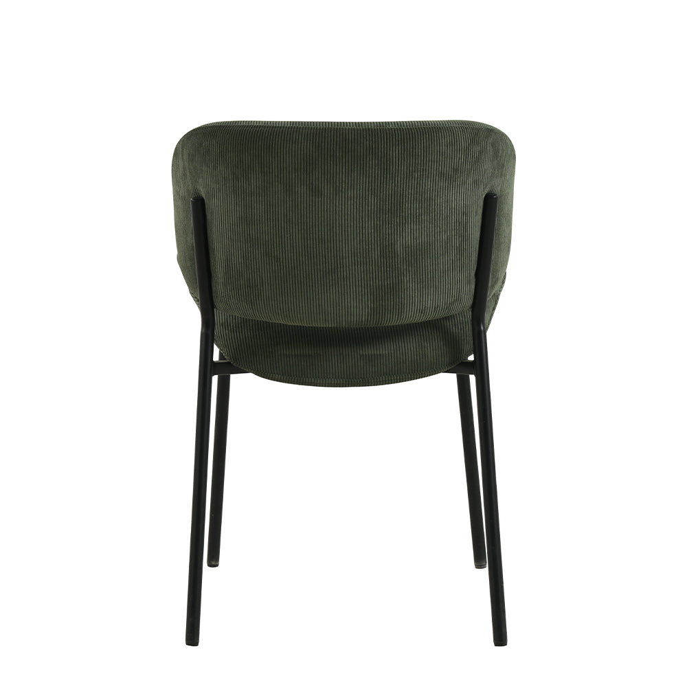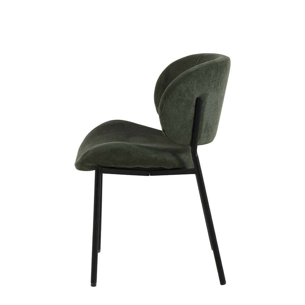 De donkergroene ribstof voelt niet alleen luxueus aan, maar is ook duurzaam en eenvoudig te onderhouden. Het voegt textuur en warmte toe aan de stoel, waardoor hij nog uitnodigender wordt.