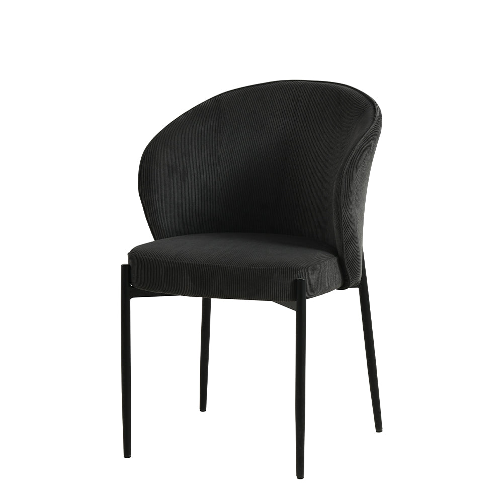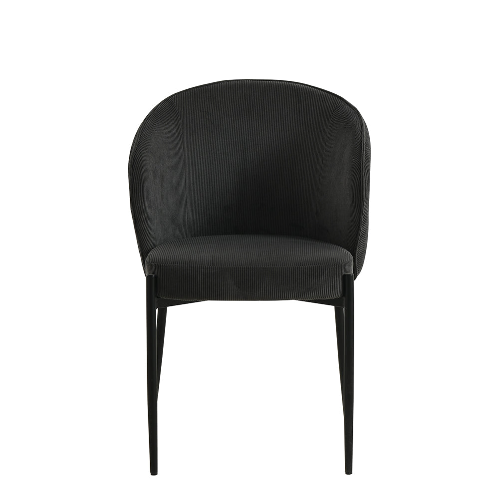 De donkergrijze ribstof voegt een vleugje textuur toe aan het geheel, terwijl het zwarte gepoedercoate metalen onderstel een solide en duurzame basis biedt. Hierdoor straalt de stoel niet alleen eigentijdse charme uit, maar garandeert het ook stabiliteit en betrouwbaarheid bij dagelijks gebruik.