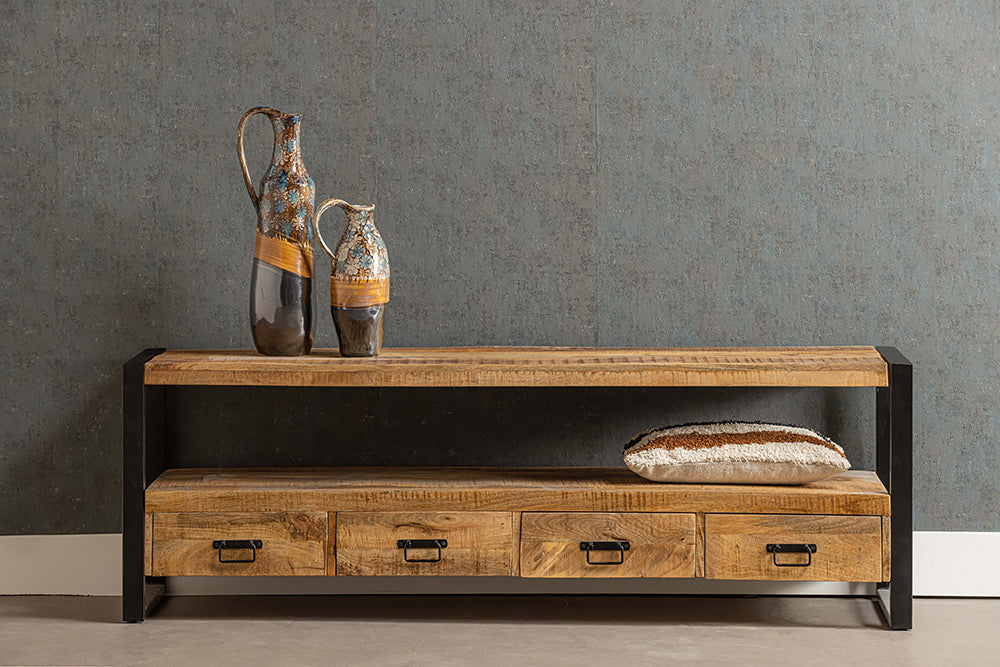 Het massieve mangohout is behandeld met meerdere lagen houtolie met daaroverheen een natuurlijke bijenwas, zodat het hout gemakkelijk afneembaar is met een vochtige doek om de kast mooi schoon te houden. De metalen poten en de handgrepen zijn afgewerkt met een zwarte poedercoat. De bovenste plank heeft een dikte van ongeveer 5 cm.