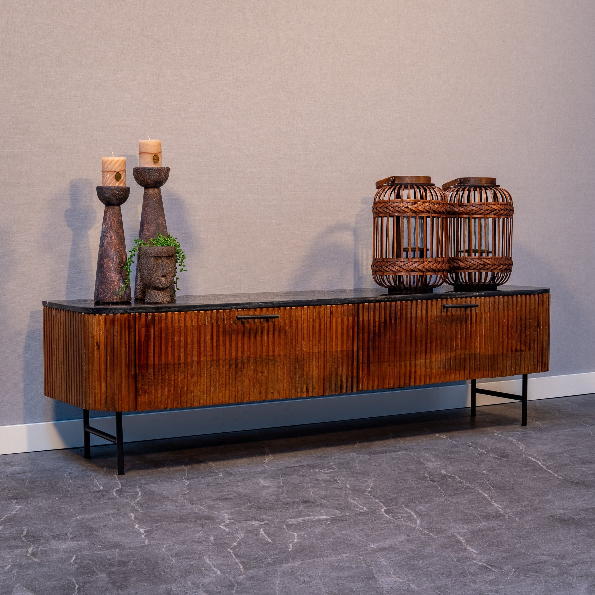 Het Mangohouten TV meubel Levi 180 cm is een stijlvolle toevoeging aan elk interieur. Met een prachtige walnootkleurige laklaag en een elegant marmeren blad straalt dit meubel pure klasse uit.