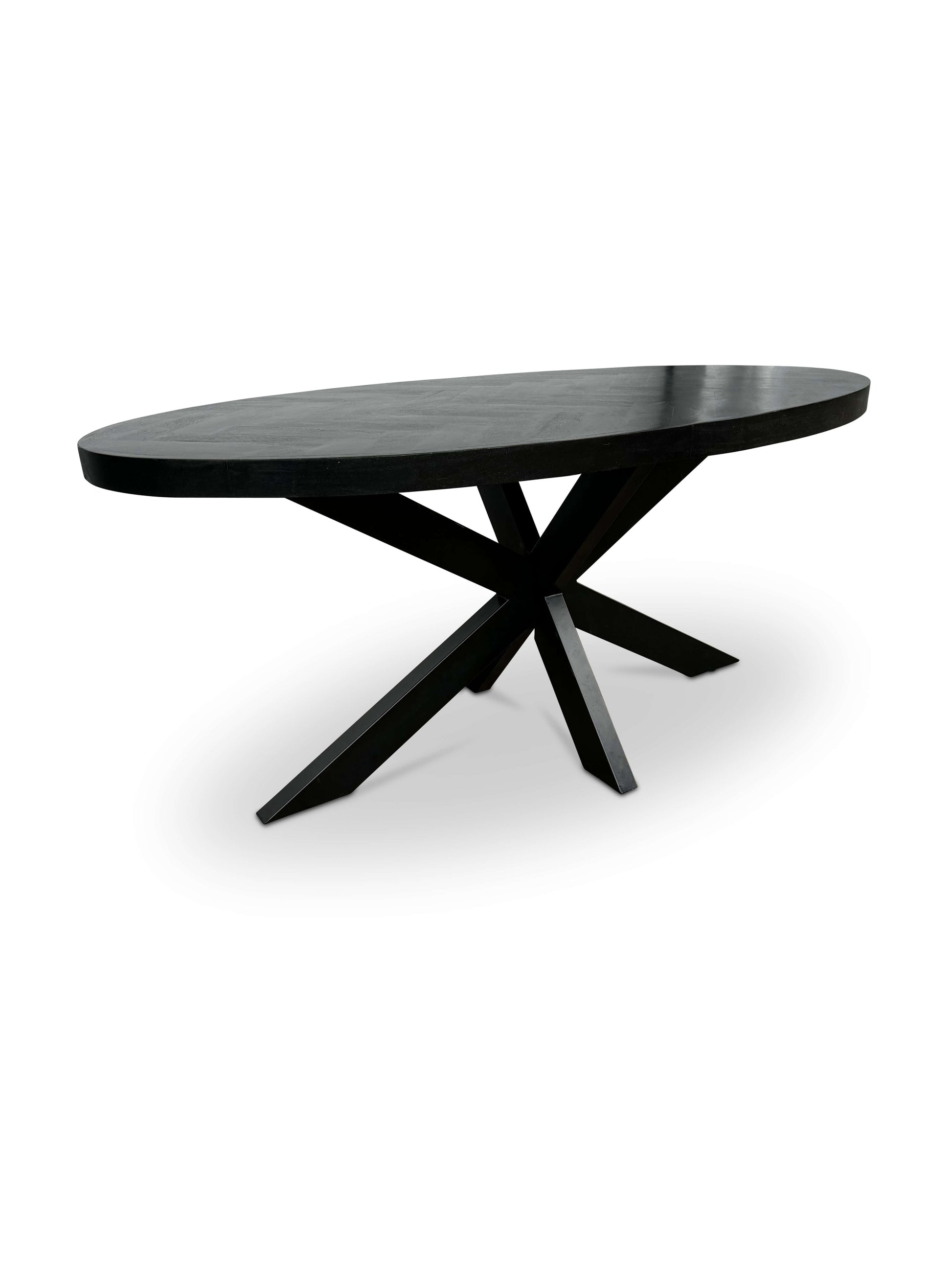 Kortom, deze ovale eettafel van mangohout met visgraatpatroon en kruispoot is een echte blikvanger en een must-have voor elke liefhebber van eigentijds design.