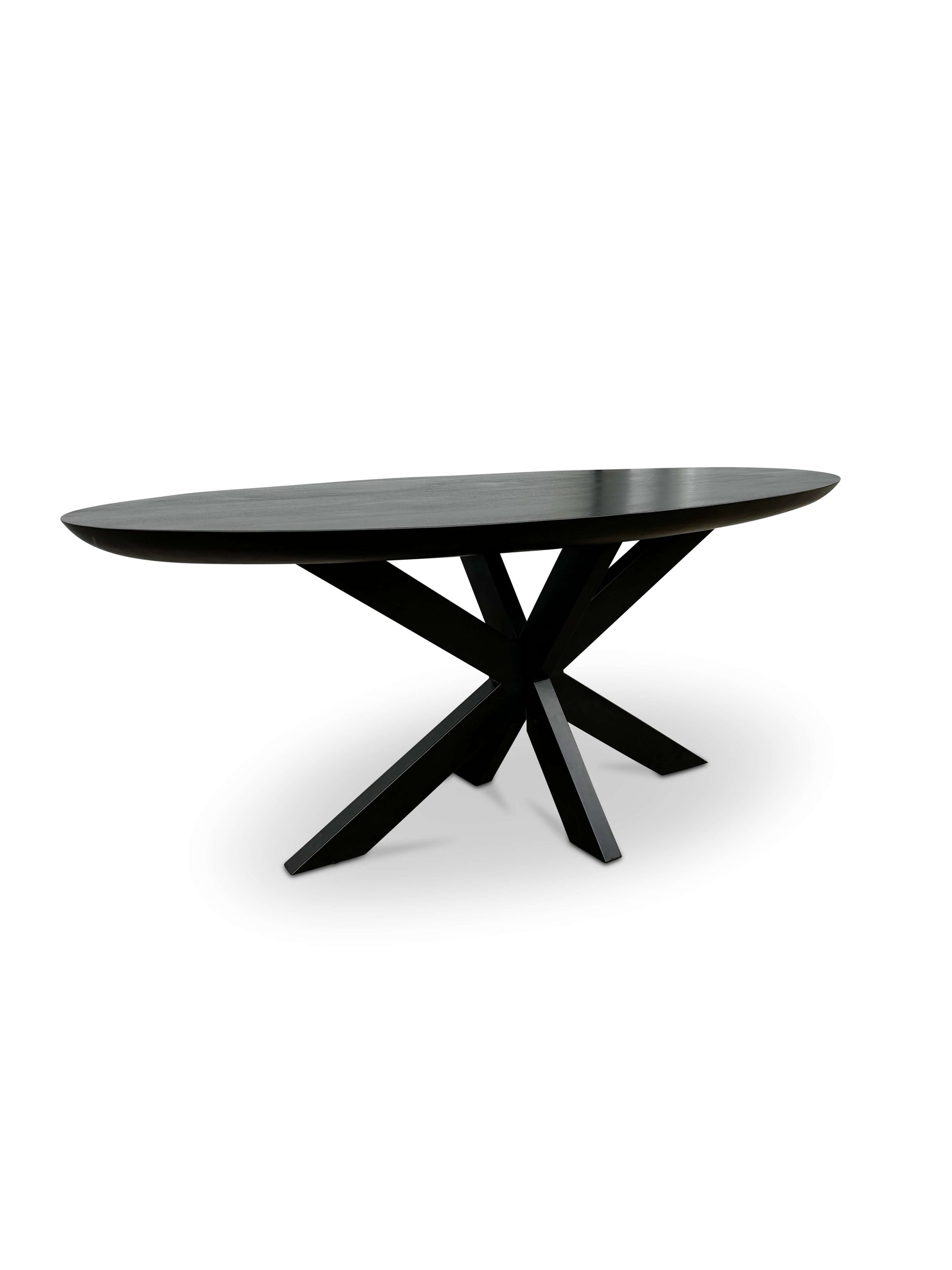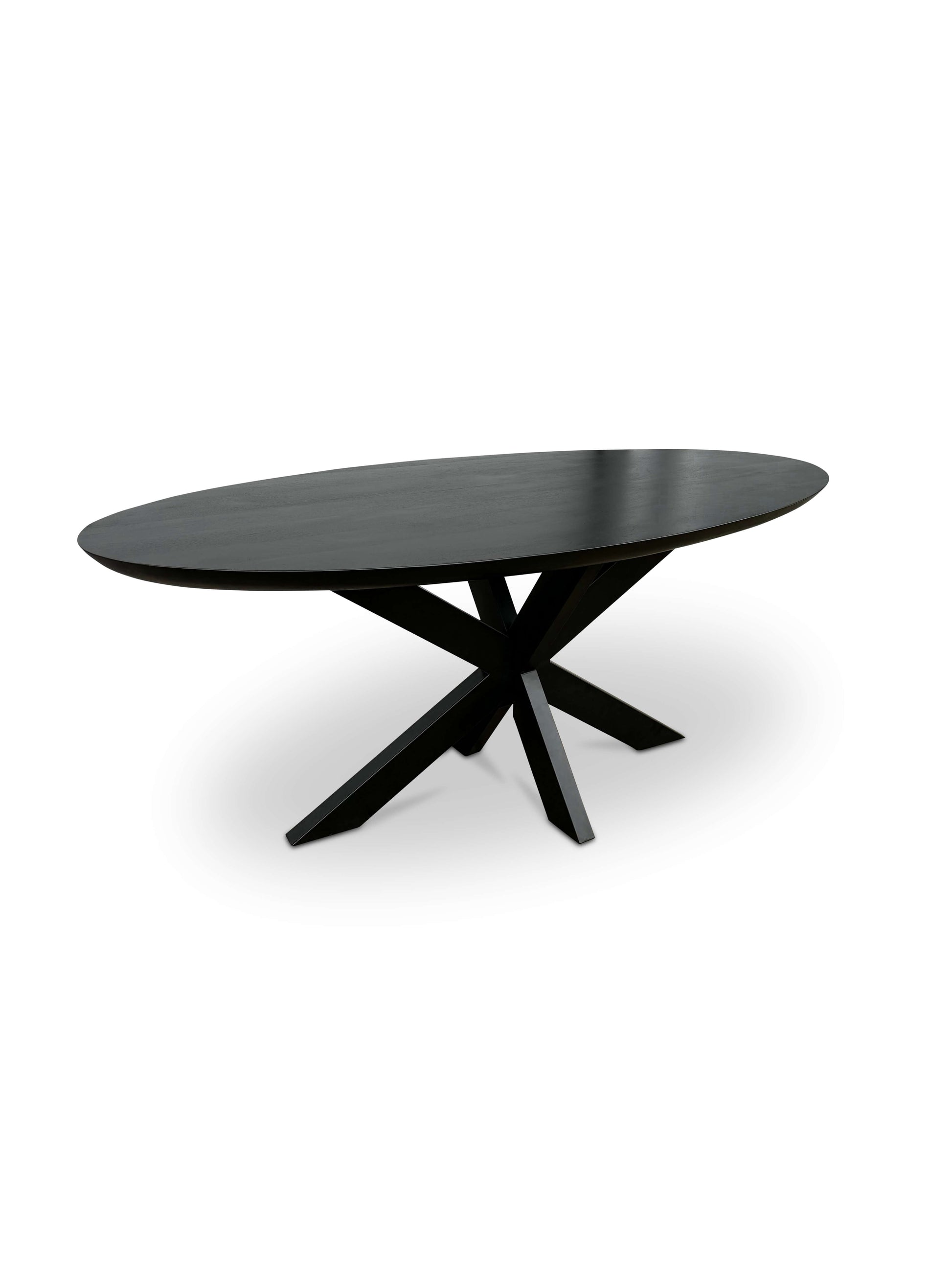 Deze prachtige ovale eettafel is gemaakt van hoogwaardig mangohout en heeft een mooie, diepe zwarte kleur. De verjongde rand van de tafel geeft deze een unieke uitstraling die de aandacht trekt en een gevoel van elegantie en verfijning toevoegt. Het mangohout is zeer duurzaam en heeft een mooie, warme uitstraling met karakteristieke houtnerven en een subtiele glans.